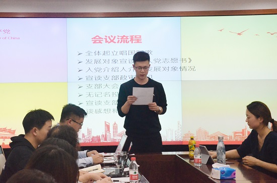 大会第三项,由各位发展对象的入党介绍人介绍发展对象情况。入党介绍人汇报了发展对象的基本情况,包括发展对象的入党动机、发展对象对党的认识、发展对象培养考察期间的现实表现,发展对象的优缺点分析等。综合各项表现,支部有表决权的成员均表示同意将他们发展为预备党员。大会第四项流程,组织委员徐东辉同志宣读了各位发展对象及家庭主要成员的政审意见,认为均政审合格符合发展党员的要求,同意发展。