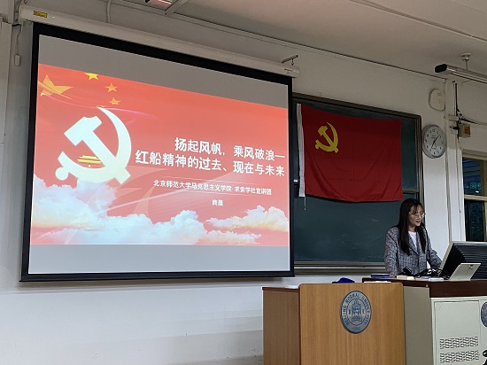 在建党一百年这个特殊的时节,我们更应该回首过去,回到那南湖上的小小红船,学习党的红船精神,更加坚定地砥砺前行。2021年4月19日晚,swag视频 教二楼301教室,swag视频 学生党支部邀请马克思主义学院求索学社宣讲团商晨同学为同学们讲述红船精神那段坎坷求索的历史。