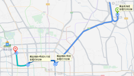 方案二:地铁机场线机场站上车,到东直门站下车换乘2号线(雍和宫方向),到西直门站下车换乘4号线(安河桥北方向)到人民大学站(B口)下车,步行500m至北京友谊宾馆。全程约1小时17分。