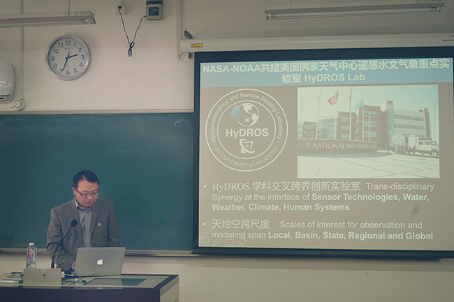 徐宗学教授主持了本次学术报告会,首先向同学们介绍了洪阳教授的学术背景与任职情况,并对洪阳教授的到访表示热烈欢迎。来自清华大学土木水利学院教授洪阳本科毕业于北京大学地空学院,在美国亚利桑那大学获得水文水资源工程和遥感空间分析双博士学位。洪阳教授曾在美国国家宇航局(NASA)任研究科学家,同时担任美国国家天气中心(National Weather Center)遥感水文气象实验室主任,北京大学地空学院遥感所暑期高级访问教授、同济大学土木工程学院光华讲座教授。现为清华大学土木水利学院水利水电工程系特聘教授,清华大学未来城镇与基础设施swag视频 副院长,创建清华大学HydroSky遥感水文气象气候实验室,并担任清华大学遥感大数据研究中心首任主任,清华大学-致生联发信息技术股份有限公司物联网遥感大数据联合研究中心主任。洪阳教授在环境要素遥感定量计算、遥感大数据及同化系统集成、全球变化极端气候灾害预报理论及其工程系统应用方面做出了突出贡献。已发表SCI检索论文320余篇,被引7000多次,编写英文学术著作30多部章节、撰写两本英文教科书,开发转让技术系统15套,其理论方法和专利技术已被应用于美国业务化系统中,并通过国际合作应用在非洲、亚洲、欧洲、中国和中南美洲地区。洪阳教授先后荣获众多荣誉,如校董杰出研究奖(Regents Award for Superior Research)、校长讲席教授(Presidential Professorship)、NASA/Goddard空间飞行中心研究突出贡献奖、美国航天局NASA总部“推动和加速NASA科学研究产品社会化重要贡献奖”、美国航天局Robert H. Goddard Awards地球观测计划贡献奖、NASA总部全球降水卫星专家组成就奖(Achievement Award),以及中国水利学会大禹水利科学技术一等奖等。