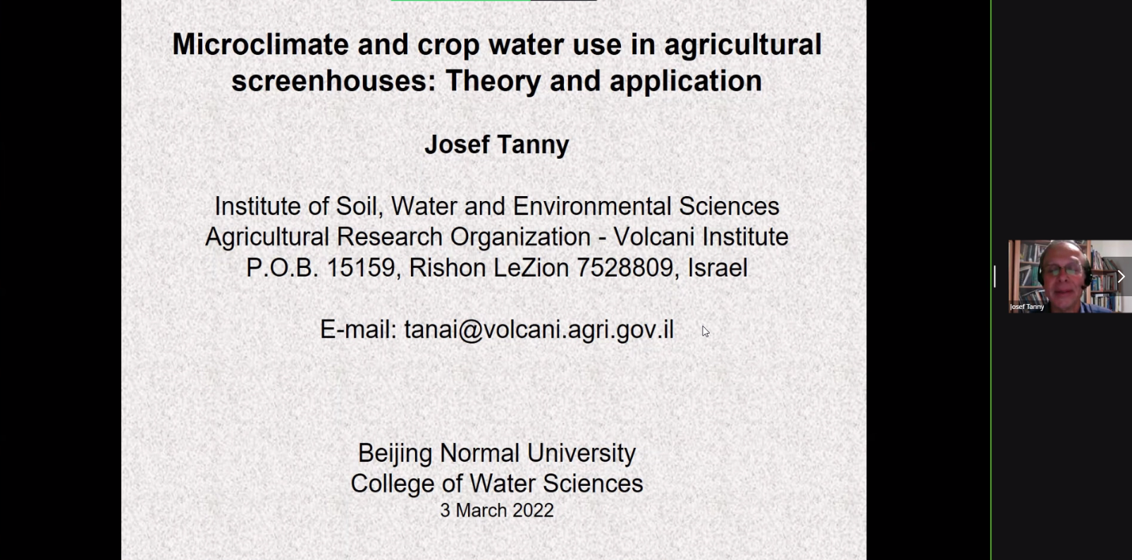 swag视频 推出中外专家系列讲座,以色列Josef Tanny博士受我院刘海军教授的邀请,分别于北京时间2022年3月3日和11日13:30-15:10开展了以“Microclimate and crop water use in agricultural screenhouses: Theory and application”为主题的线上系列讲座。Josef Tanny博士是以色列农业研究组织ARO土壤-水-环境研究所高级研究员,HIT-霍隆理工学院高级讲师。Josef Tanny博士毕业于特拉维夫大学机械工程专业,研究领域是农业气象学与环境物理学,已在Agricultural and Forest Meteorology等国际期刊发表80余篇同行评议论文。他主要使用先进的微气象方法与模型来测量和模拟作物以及开放水体的蒸散发量,侧重于将小气候与作物用水应用于受保护的栽培系统。