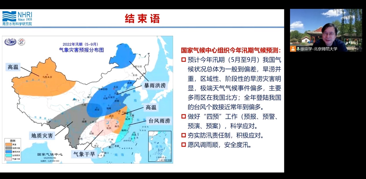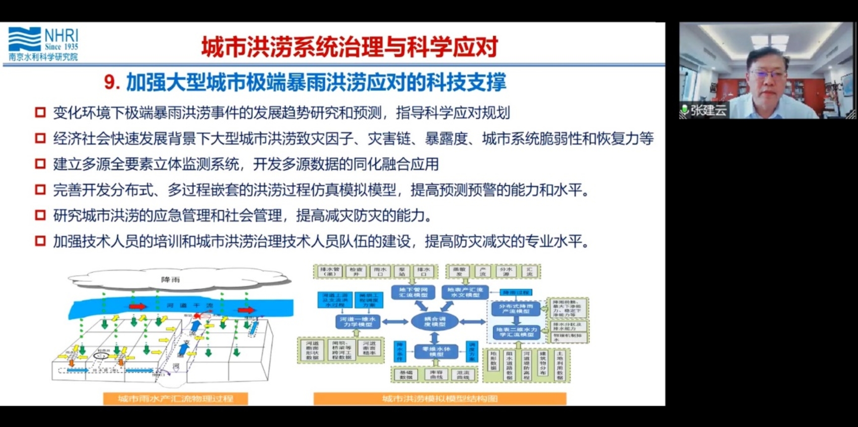 张建云院士首先对大型城市极端暴雨洪涝灾害成因进行了分析,结合十三五重点研发计划项目研究成果,简要介绍了城市洪涝灾害评估方法。针对华北地区近年来极端暴雨洪涝灾害频发的问题,张院士梳理了我国华北地区发生过的极端暴雨洪涝事件,并介绍了其团队将郑州暴雨移植到北京永定河、北运河流域进行洪水演进分析的相关结果。对于防灾减灾的科学应对,张院士表示今年防汛减灾预期充满挑战,提出了包括构建韧性城市在内的一系列对策措施,着重强调了“四预”即预报、预警、预演、预案的重要性,以法国马赛中心广场的6处大型地下蓄水场所、广州东瀛涌深邃工程、日本首都圈外围排水系统、英国东伦敦的地下生态网络等为案例,分析了地下空间多元化利用的潜力。最后,张院士强调要加强重要基础设施的空间布局与就地防护,保障城市生命线安全。张院士报告结束后,徐宗学教授主持了讨论与问答环节,张院士进行了一一解答。