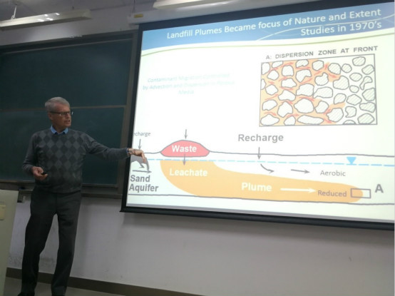 John A. Cherry结合我院地下水研究的需求,做了题为“On the nature and implication of groundwater contamination”的学术报告,报告从地下水的重要性和地下水运动基本概念入手,首先介绍了加拿大的乔克河国家实验室核废物处置场地和污染特征;再从垃圾填埋场污染羽、自然梯度示踪试验、下水道污染羽、净化系统与地下水、硝酸盐污染和新型污染物污染的研究现状,也介绍了地下水污染的监测手段;接着从细菌、裂隙和隔水层之间的关系介绍了工业污染物,DNAPL污染和实验研究,农药和地下水污染,页岩气开发过程中逃逸甲烷泄露,新型污染物等内容,最后指出地下水污染的难修复性和污染机理的复杂性,建议注重保护和管理 。之后,参与人员与Cherry教授围绕场地地下水污染控制与修复、地下水位和污染监测、高放废物地质处置等议题进行了热烈讨论和交流。报告和交流时间共2个小时。