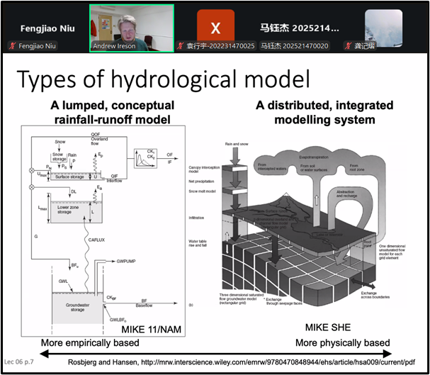 此外,课程还系统介绍了水文模型的类型与构建逻辑,从集总式模型到分布式模型,详细展示了如何将寒冷地区水文过程整合到模型中进行模拟分析,强调了不同模型在机理和适用性方面的差异,让我们全面理解寒冷地区水文系统的复杂性及其建模所面临的挑战。来自swag视频 、北京林业大学等单位的多名专家教授、硕博士研究生参与了本系列课程,课程最后Andrew Ireson 教授还就大家关心的问题开展了交流讨论。