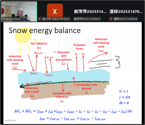 Andrew Ireson 教授的系列课程系统而全面地介绍了寒冷地区水文过程的核心机理、观测方法与模拟手段。课程从水在寒区的多种存在形态入手,如冰川、积雪、地表水等,强调了寒区水文研究在全球变化背景下的重要性。随后,教授以基础热力学和地表能量平衡为理论框架,深入解析了积雪融化、冻土冻融、蒸发等关键水文过程的水热交换机理,并通过公式和示意图的形式,展示了雪与大气、土壤之间复杂而动态的能量交换。