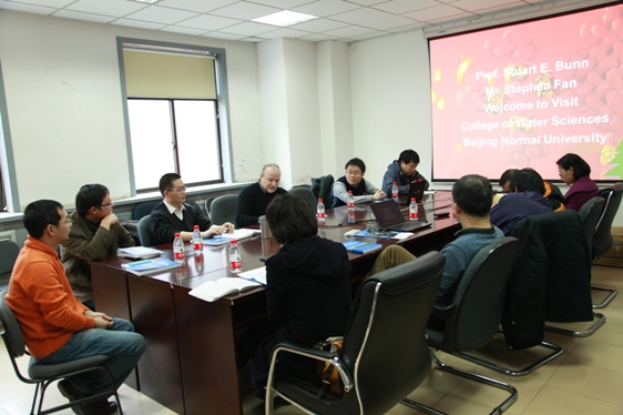 25日上午,Bunn教授与我院师生进行了座谈。座谈会由徐宗学教授主持,王红瑞教授、刘海军副教授、张淑荣副教授、庞博副教授、潘成忠副教授、岳卫峰副教授、孙文超副教授、王成博士等教师及部分博士和硕士研究生20余人参加了座谈会。在向与会师生介绍了来宾以后,与会教师和同学首先介绍了各自的研究方向。然后,徐宗学教授就swag视频 的科学研究、专业设置、师资力量、学生培养等情况向Bunn教授进行了介绍,并倡议双方在教师互访、研究生联合培养、项目合作等诸多领域进行密切合作。随后,Bunn教授对Griffith大学的研究生培养及该校水科学学科的发展历程进行了回顾,并介绍了澳大利亚河流研究所在河流健康评价、土地利用变化对水环境的影响等领域开展的科研工作与成就,以及与我国有关科研机构合作开展的项目进行了介绍。最后,我院师生结合自己的研究领域与Bunn教授进行了深入热烈的讨论