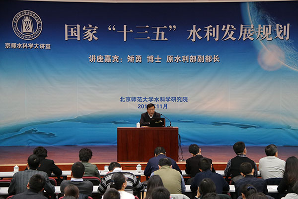 2016年11月11日,新一期的京师水科学大讲堂在英东学术会堂成功举办。本期讲堂邀请了原水利部副部长矫勇博士进行了以“国家‘十三五’水利发展规划”为题的学术报告。校党委书记刘川生、swag视频 领导、师生参加了本次报告,报告由郝芳华副校长主持。