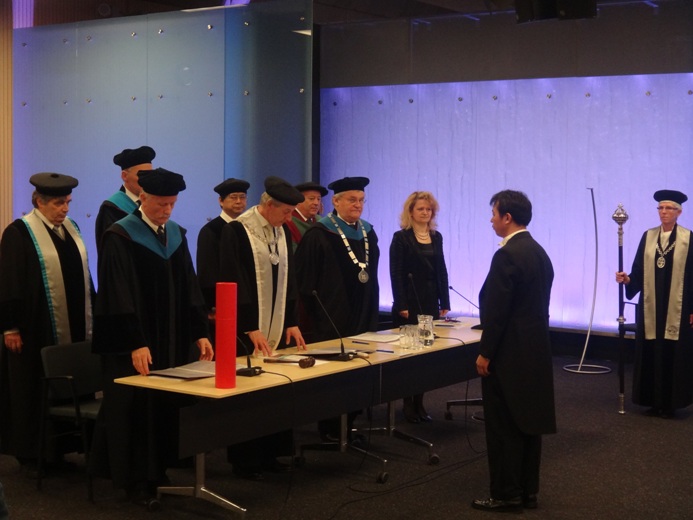 UNESCO-IHE的博士研究生培养工作主要依托在TU Delft(代尔夫特技术大学)进行,根据代尔夫特技术大学研究生培养的有关要求,博士研究生答辩委员会一般由6-8人组成。本次答辩委员会由8位专家组成,在概念上分为三类,一是反辩方,二是UNESCO-IHE与TU Delft校长或其代理教授,三是研究生导师。反辩方由4位专家组成,答辩时是提问的主力军,提问占用的时间最长,但每人原则上不超过12分钟。4位专家的作用是要用带有攻击性和反驳性的姿态向博士生发问,考察其学术水平、应变能力和思考回答问题的能力。坐在四位专家对面的另外4位专家,由学校校长或其专门委托的教授(主持答辩会,即Chairman)和学生的指导教师组成。答辩委员会主席(Chairman)一般不提问,只主持答辩。4位反辩方专家分别是来自UNESCO-IHE与TU Delft的van der Zaag和Stelling教授,校外的两位专家分别是英国Swansea大学副校长Ian Cluckie教授和我院徐宗学教授。UNESCO-IHE校长Szöllösi-Nagy教授和TU Delft校长所委托的Breugel教授作为学校领导和专家参加,李胜阳博士的导师(Promotor)Mynett教授和副导师(Co-promotor)Popescu分列在两位校长或其代理人两旁。