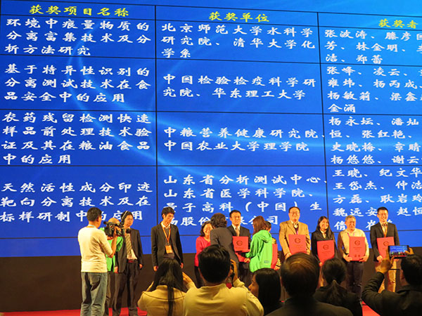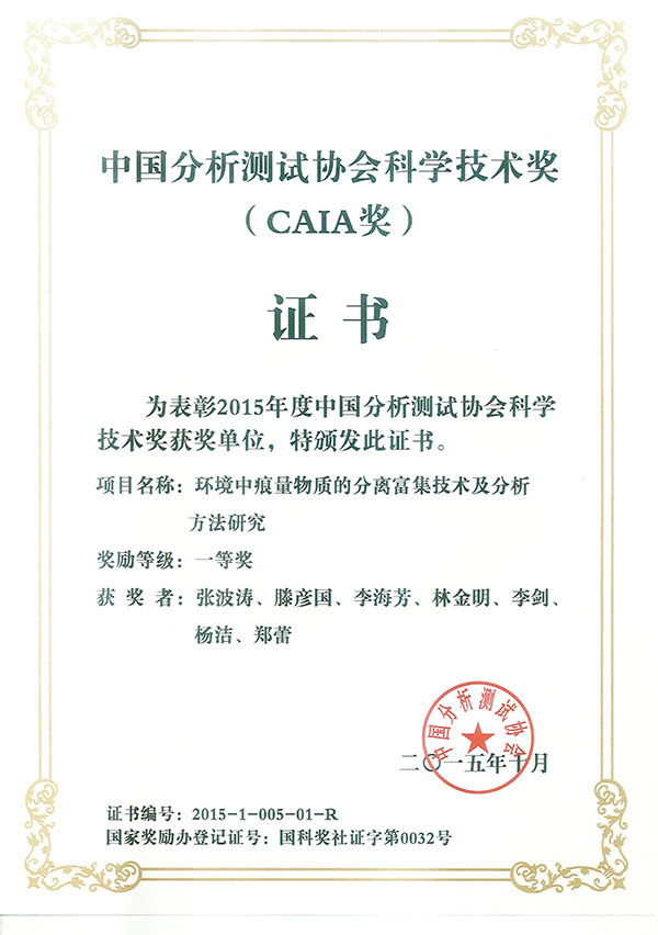 2015年10月27日下午,中国分析测试协会科学技术奖颁奖仪式在国家会议中心隆重举行。由我院教师张波涛、滕彦国、李剑、杨洁、郑蕾和清华大学化学系教师李海芳、林金明等负责研究的“环境中痕量物质的分离富集技术及分析方法研究”成果荣获2015年中国分析测试协会科学技术奖一等奖。