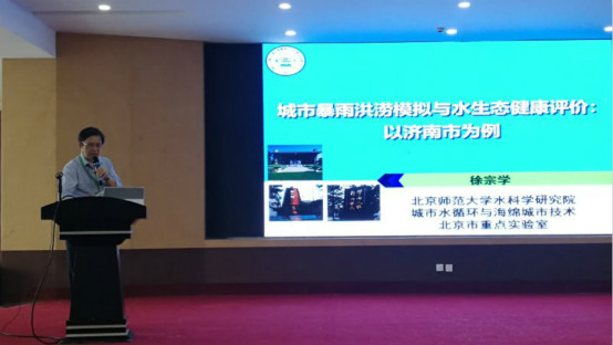 随后的20个主题报告分别围绕着“城市水管理”、“城市水灾害及其防治”、“城市水生态安全”、“智慧水利”、“海绵城市”等多个议题开展研讨。徐宗学教授以“城市暴雨洪水模拟与水生态健康评价:以济南市为例”为题,做了精彩的学术报告,系统介绍了我院近年来围绕着济南市水生态文明城市和海绵城市建设所取得的研究成果,引起了与会专家的浓厚兴趣。