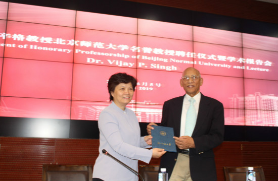 大会伊始,郝芳华副校长亲切地回忆了她与维杰·辛格教授的友好交流往事,然后介绍了维杰·辛格教授的学术研究背景和任职情况。随后,郝芳华副校长授予维杰·辛格教授swag视频 名誉教授聘任证书,并且赠送了具有深远意义的礼物—北师大胸针。