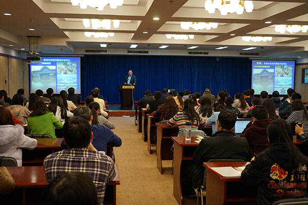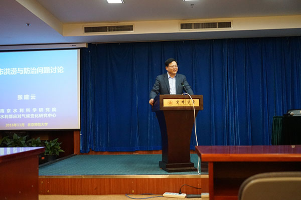 郝芳华副校长主持了本次学术报告会,郝副校长首先向与会师生简要介绍了张建云院士的基本情况,并对张院士的到访表示热烈欢迎。随后,张建云院士作了题为“城市洪涝与防治问题讨论”的学术报告。报告首先对目前我国城市洪涝问题越来越突出的现象进行了梳理。随后,张院士从全球变化对暴雨特性的影响、城市热岛与雨岛效应、城市发展对产流机制的影响、城市发展对洪水调蓄空间的影响、城市微地形洪涝的形成特征、城市排水标准特点及我国城市应急管理能力等方面对城市洪涝成因进行了全方位多角度深层次的剖析。并对城市洪涝防治相关的海绵城市建设、城市洪涝防治标准问题、城市洪涝一体化治理问题及城市洪涝防治亟需研究的关键问题进行了详细介绍。为进一步深化大家对洪涝灾害的认识,张院士还对2016年洪涝主要特点及成因进行了详细说明。