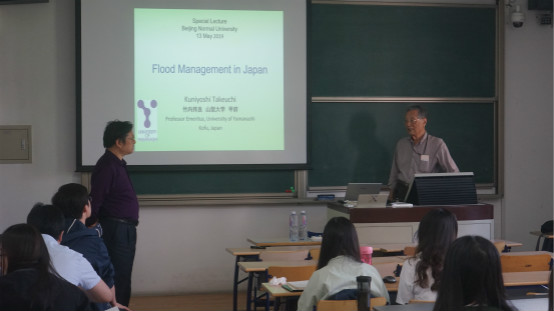 徐宗学教授主持了本次学术报告会,他首先对竹内邦良教授的来访表示热烈欢迎,并向与会人员详细介绍了竹内教授。随后,竹内邦良教授做了题为“Flood Management in Japan”的学术报告。报告从日本洪灾损失变迁、防洪法沿革、防洪工程与非工程措施包括洪水风险图和人员撤离等四个方面,多角度、多层次,深入浅出地介绍了日本面临的各种灾害问题、应对的措施及人员撤离案例。报告结束后,老师和同学们围绕着报告内容进行了深入的交流。最后,徐宗学教授对竹内邦良教授的精彩报告表示衷心的感谢。课程结束之前,竹内邦良教授愉快的和参加交流的部分师生合影留念。