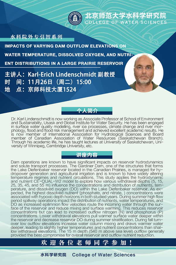 【学术讲座】IMPACT OF WATER DAM OUTFLOW ELEVATIONS ON WATER TEMPERATURE,DISSOLVED OXYGEN,AND NUTRLENT DISTRIBUTIONS IN A LARGE PRAIRIE RESERVOIR